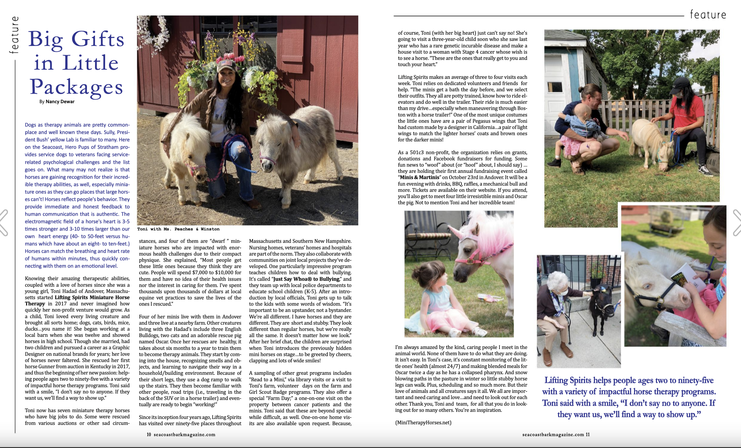 The tallest of Toni Hadad’s miniature horses may stand just 36 inches, but he – and the rest of her miniature herd – is all heart. Since Toni founded Lifting Spirts Miniature Therapy Horses, Tonka, Banshee and the rest of her mini gang have travelled all over New England, spreading joy, hope and love to children and adults of all ages and abilities.